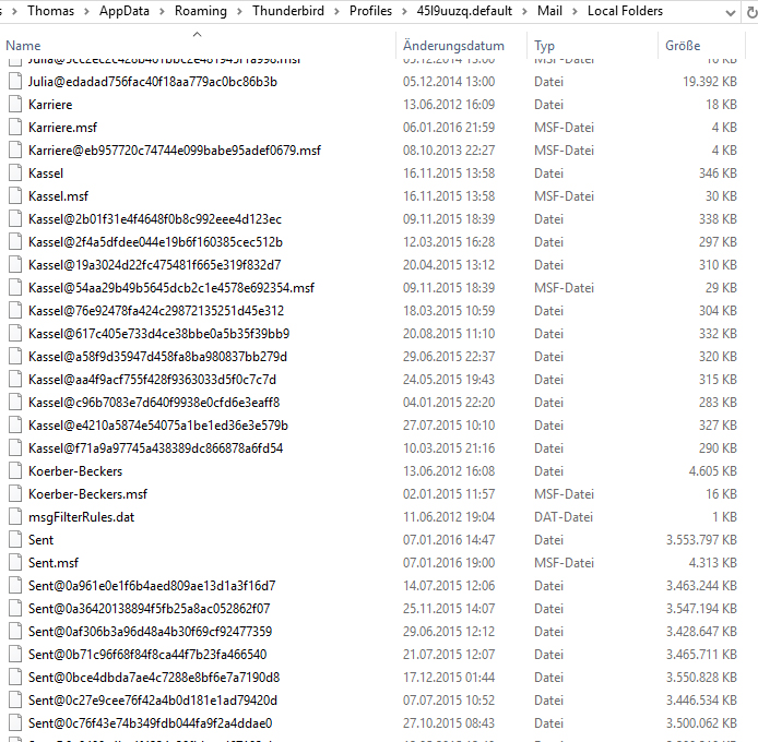 Auch auf der externen Platte gibt es je nur eine MSF-Datei, dafür aber zig der großen "Mail-Dateien" mit seltsamen "@..."-Dateinamenerweiterungen (manchmal weniger, manchmal mehr/allein vom Ordner "Sent" aber z. B. 635 Stück!) und das macht dann die Platte voll. Das spricht - meiner Meinung nach - dagegen, dass es sich um irgendeine komische Form von regelmäßiger Sicherung handelt, denn dann müsste es ja von jedem Ordner genau gleich viele Sicherungen geben, oder?!