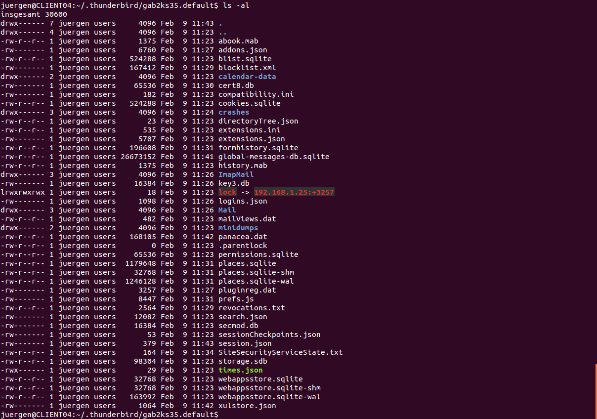 Allerdings bin ich jetzt auch sehr verwundert, nach erneuter Deinstallation, löschen der Verzeichnisse und Neuintsallation, befindet sich im .thunderbird Unterverzeichnis ein file namens lock mit der lokalen IP, der auf den anderen Rechnern nicht zu finden ist. Sollte ich mir Sorgen machen?