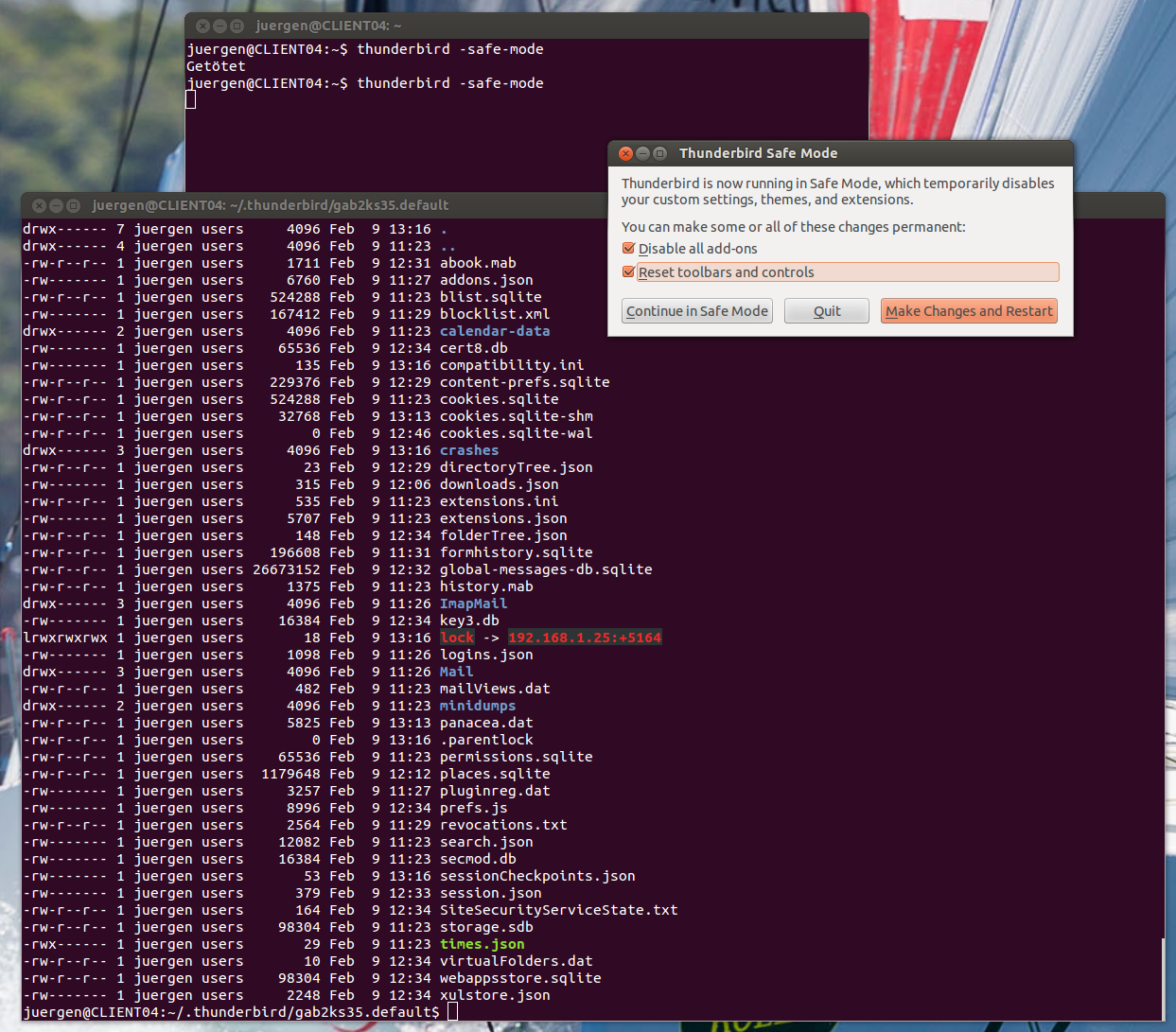 Neulich morgens aus heiterem Himmel ließ sich Thunderbird nicht mehr starten. Das Programm startete nicht und brachte die Meldung "Sende Login-Daten ...". Auf dem Laptop funktioniert es aber weiterhin (gleiche Konfiguration, Ausnahme Ubuntu 14.04 LTS).