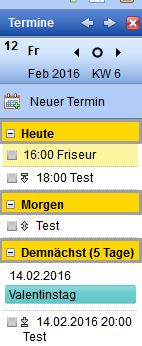 Wenn man allerdings etwas weiter in der Zukunft einen längeren Termin einstellt oder hat (z.B. 15.02. - 18.02.), dann sieht man aktuell nur den Beginn-Termin am 15.02.. Keinen "Über-den-Tag-Termin" am 16.02. und 17.02 und keinen "Ende-Termin" am 18.02. Das wird erst dann wieder sichtbar, wenn der 15.02. "Heute" ist.