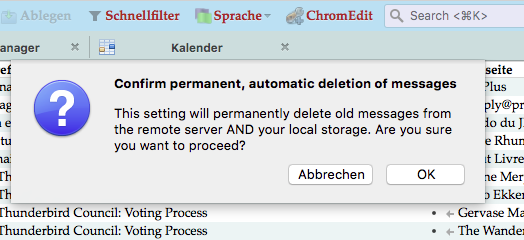 Bloß hilft dieser Warndialog auch nicht gegen Datenverlust, wenn man wissentlich alte Nachrichten automatisch und endgültig löschen will, Thunderbird aber in gewissen Fällen statt dessen die neuesten Nachrichten endgültig löscht.