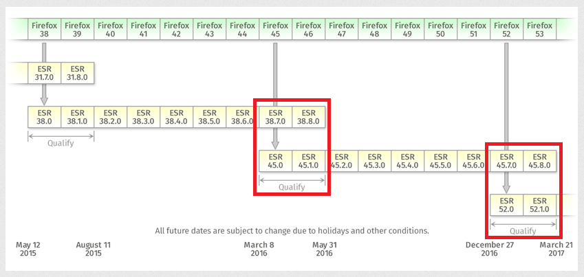 aktuell ist Firefox 45 ESR, aber Firefox 38 ESR wird noch einige Wochen mit Sicherheits-Update versorgt.