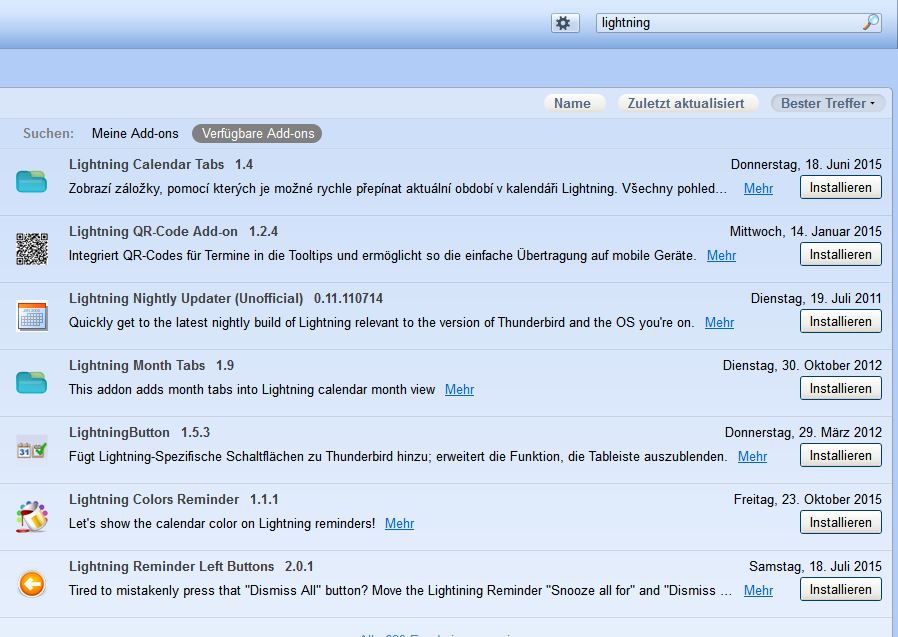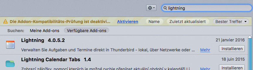 Dies erkannte man schon daran, dass der "neue" Donnervogel darauf hingewiesen hat, dass das bisherige Lightning nicht mehr kompatibel ist und er das neue benötige. Thunderbird fragte dann an, ob er danach suchen und die neue Lightning-Version installieren solle.