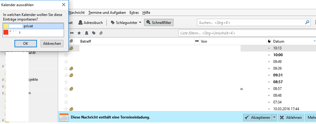 ich habe heute einen GoogleAccount über den Provider für Google Calendar 2.7 eingebunden. Es werden alle Kalender angezeigt und ich kann auch vom Thunderbird schreiben. Bekomme ich jedoch eine Termineinladung und klicke auf akzeptieren habe ich in der Maske "Kalender auswählen" (siehe Anhang) nur zwei Kalender zur Auswahl - leider die falschen ![]()