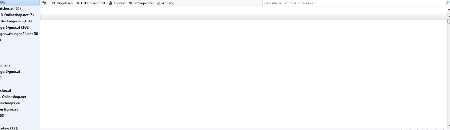 Der gruppierte Posteingang ist seit heute weiß, siehe beil. Screenshot. Die Zeilen werden nicht angezeigt, anklicken und lesen kann man aber schon. In den einzelnen Posteingängen dagegen scheint alles normal zu sein, d.h. die Mails sind also noch alle da. Das Problem scheint ausschließlich ein Anzeige-Problem, nur im gruppierten Posteingang, zu ein.