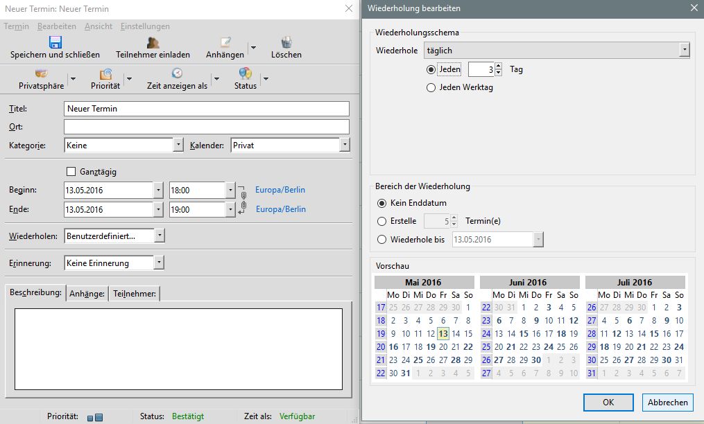 Neuen Termin einrichten und einmalig am Folgetag wiederholen. Wo finde ich eine derartige Einstellung?