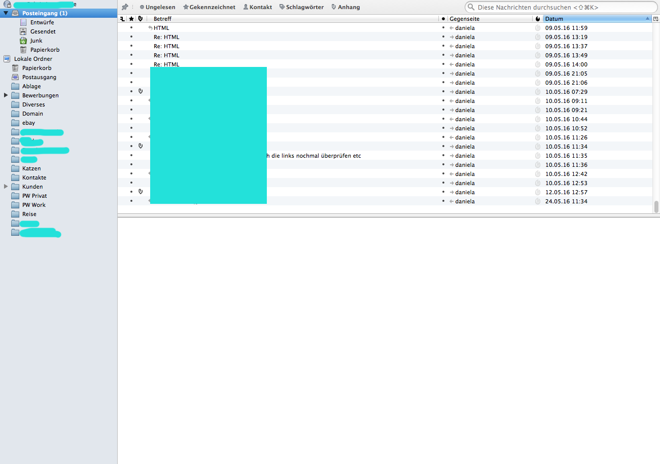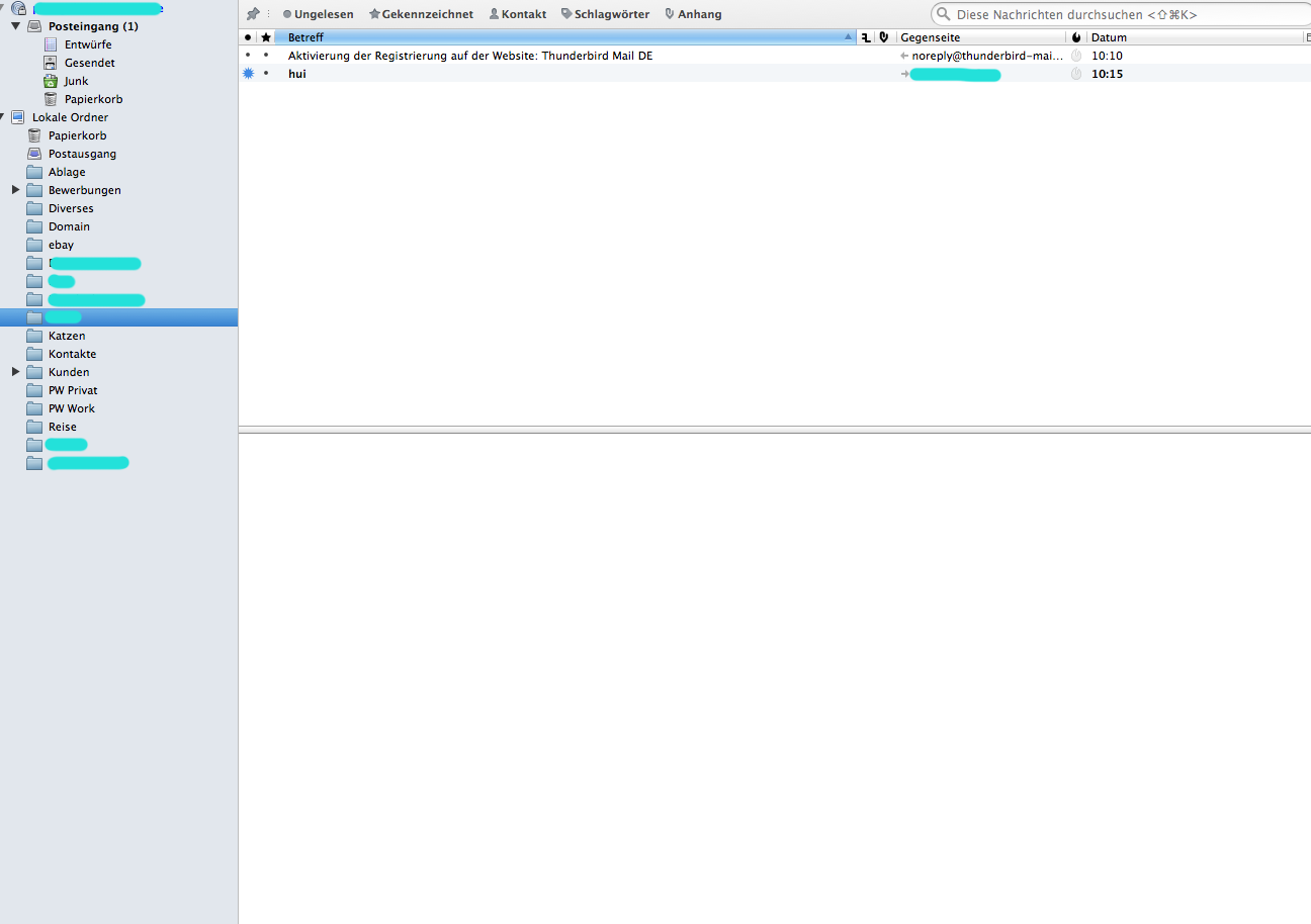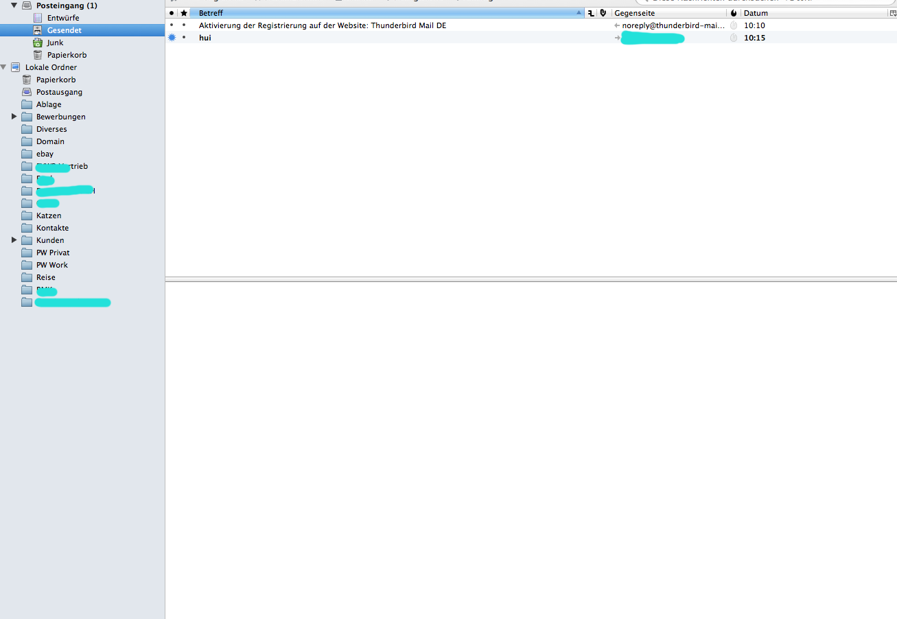 Hi, viell kann mir jemand hier helfen? Ich hab heute morgen Thunderbird aufgemacht und plötzlich spinnt es total. Ich habe dann ein Update gemacht, aber das Problem besteht trotzdem. Und zwar...ich weiss gar nicht wie ich es richtig Beschreiben soll. Also ich kann meine gesamten Ordner nicht mehr aufrufen, bzw die Inhalte darin. Mails werden versendet und empfangen (ich habe mehrere Mails verschickt, und ich sehe auch anhand einer 1, dass ich eine neue Mail bekomme habe). Aber die einzelnen Ordner in dem Postfach sind nicht mehr anklickbar. Ich hänge ein paar Screenshots an.