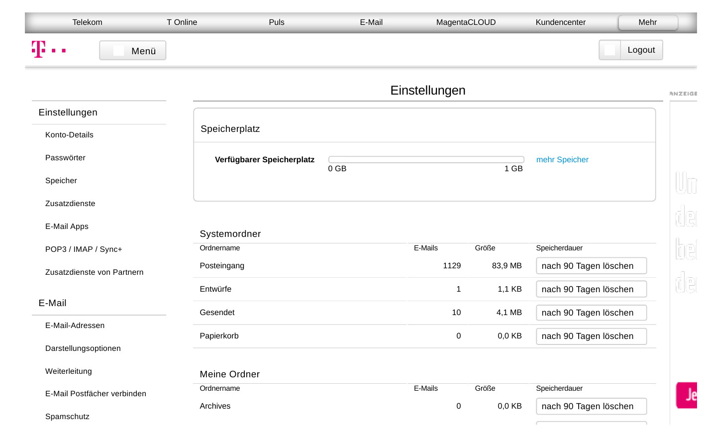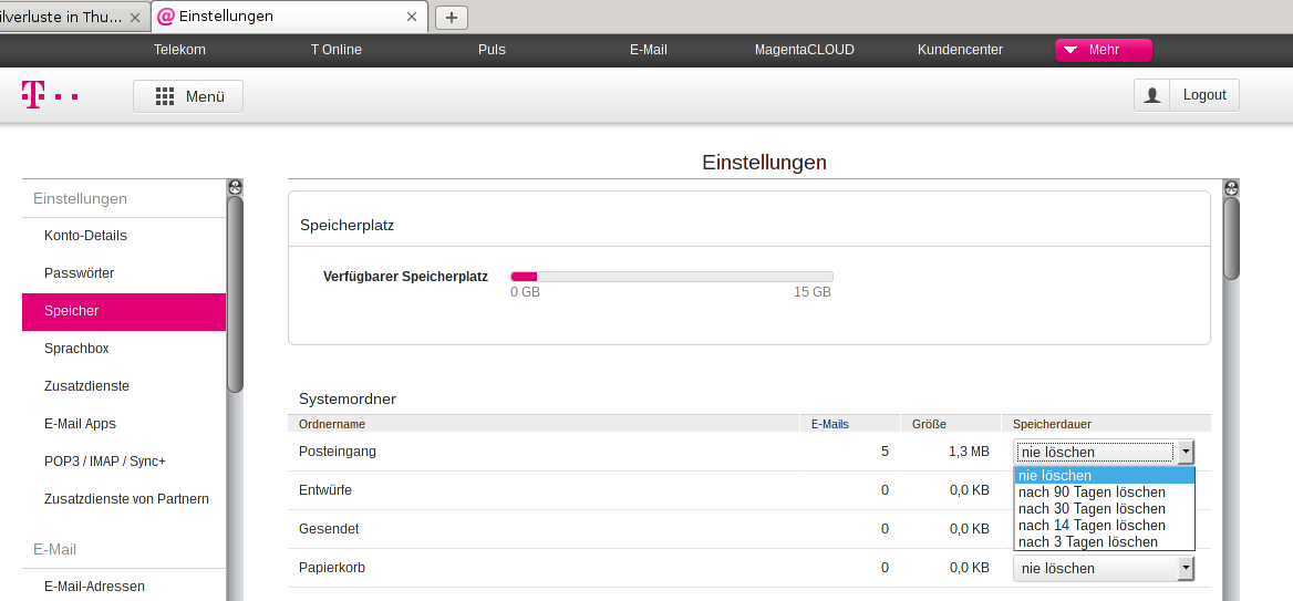 Beim Lesen der AGB deines Providers oder beim genauen Betrachten der Einstellungen in seinem Kundencenter ist dir bestimmt aufgefallen, dass "Magenta" die Voreinstellung hat, dass ältere Mails nach 90 Tagen vom Server gelöscht werden. Ist ja auch eine Möglichkeit, "Platz" zu sparen und auch zu verhindern, dass der Kunde das Quota erreicht, und keine neuen Mails mehr gespeichert werden können.