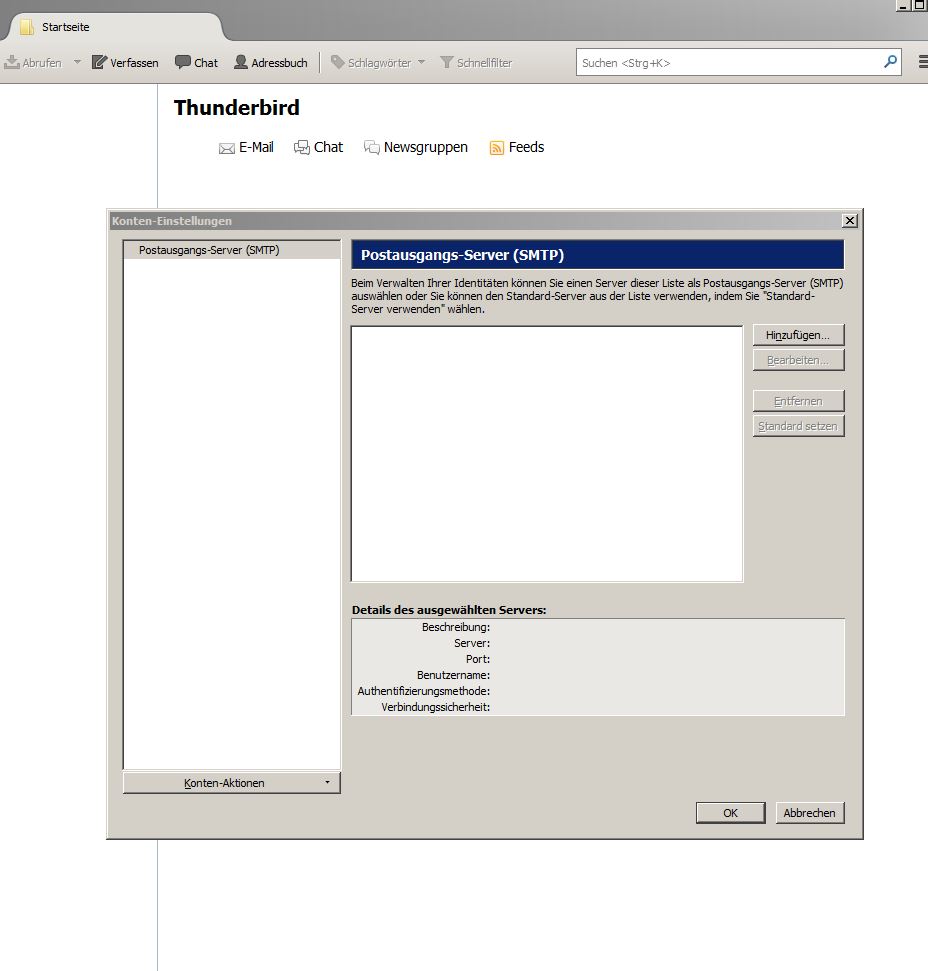 Da deine alte korrupte Datei "prefs.js" umbenannt worden ist in "prefs-1.js" und eine neue, quasi jungfräuliche Datei "prefs.js" erstellt wurde, ist das Fenster der Konten-Einstellungen derzeit noch praktisch leer!