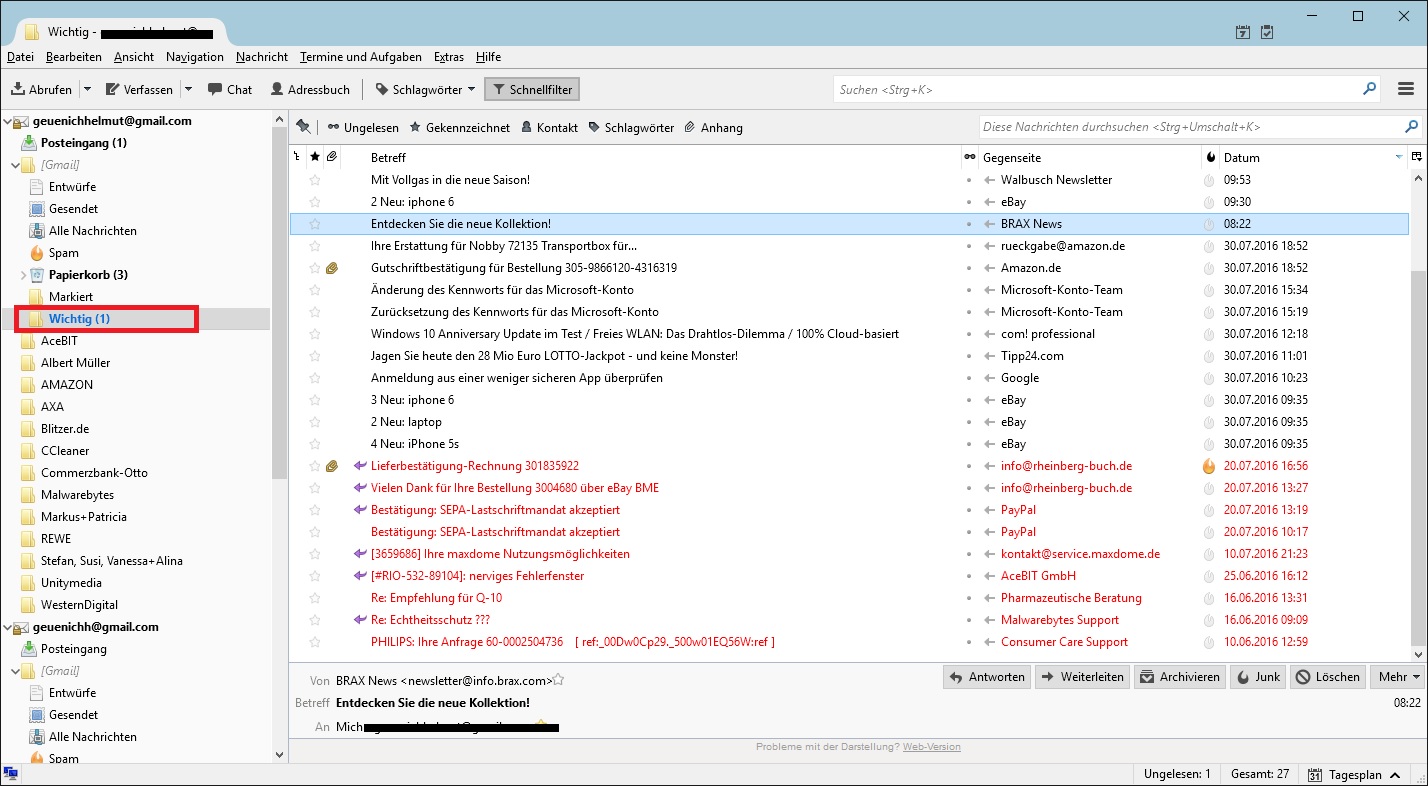 Seit ich auf Windows-10 umgestellt habe, weil da mein altes Live-Mail nicht mehr so richtig funktionierte, habe ich Thunderbird.