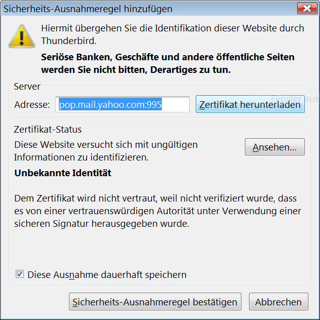 Wenn ich auf Sicherheits-Ausnahemregel bestätigen klicke, passiert nichts.