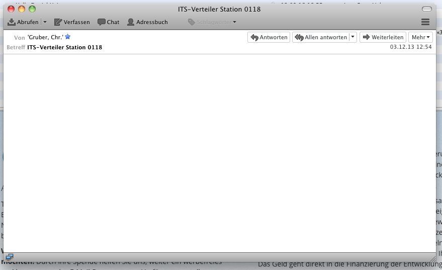 Zuerst mal zum Import: Unsere Mitarbeitergruppe bekommt regelmäßig aktuelle Adressbücher im .eml-Format zugeschickt, die sich u.a. auf meinem Rechner am Arbeitsplatz mit Outlook bestens öffnen und nutzen lassen. Die Dateien als solches scheinen also okay zu sein. Wenn ich diese Dateien zu Hause mit TB öffne, öffnet sich aber nur ein Fenster, in dem diese .eml-Dateien wie eine E-Mail dargestellt werden (s. Screenshot). Das, wozu sie eigentlich gedacht sind, nämlich E-Mails an eine bestimmte Gruppe von Empfängern zu schicken, funktioniert nicht. Trotz intensiver Suche im www habe ich keine Hints gefunden, wie ich diese .eml-Dateien tatsächlich als Adressbuch öffnen kann, oder, was noch besser wäre, sie gleich wie eine Adresse zu verwenden, d.h. eine E-Mail "an diese Datei" zu schicken. Auch die Installation des Sync-Add-ons hat nichts am momentanen Verhalten von TB geändert.