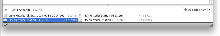 Ich bekomme in der Tat einmal im Monat eine Mail aus unserem Office, das eine Mitarbeiterliste als Word-Datei sowie drei "Email-Verteilerlisten" enthält (s.u.). Diese anhängenden Email-Verteilerlisten sind aber seltsamerweise im .eml-Format, und genau an dieser Stelle komme ich nicht weiter. Wahrscheinlich müsste ich es mir wirklich mal von einem meiner Kollegen zeigen lassen, wie sie aus diesen Anhängen brauchbare Adress-Listen machen.