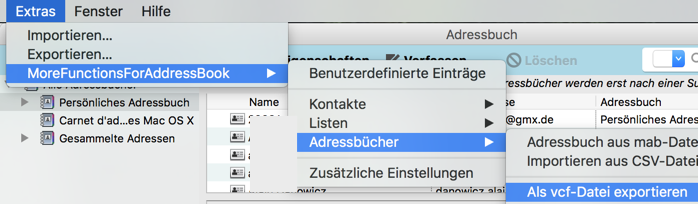 Ich habe folgende Methode des Exports mit MoreFunctionsForAdressbook getestet: das "Persönliche AB" (das eine "Liste_1" enthält) markiert > Menü "Extras" > MoreFunctionsForAdressbook > Adressbücher > usw wie im folgenden screen shot sichtbar