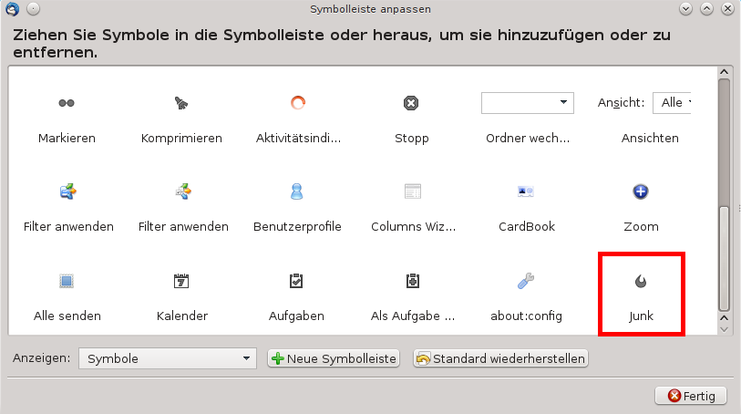 • Mails, welche das Filter bislang übersieht, sind keinesfalls zu löschen, sondern immer mit dem JUNK-Button zu bearbeiten. Ergebnis: Löschung mit einem einzigen Klick und gleichzeitig ein Lernvorgang.