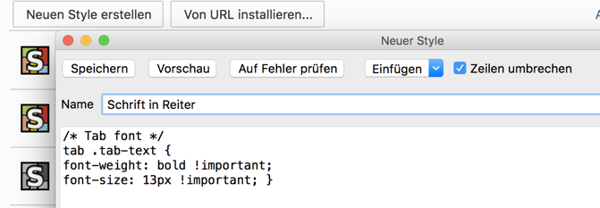 Danach erstelle ich einen neuen Style, füge den obigen Code ein und klicke auf "Vorschau". Das Ergebnis wird sofort sichtbar, die Schriftgröße im Nachrichten-Header ist deutlich um 30% erhöht:
