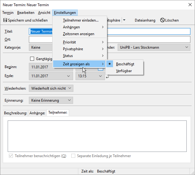 ich habe schon sehr lange das Problem, dass ich bei Terminen nicht 'abwesend' als Status auswählen kann. In jedem anderen Mail-Client (z.B. Outlook, OWA, sämtliche K9-Forks unter Android usw.) ist das möglich.