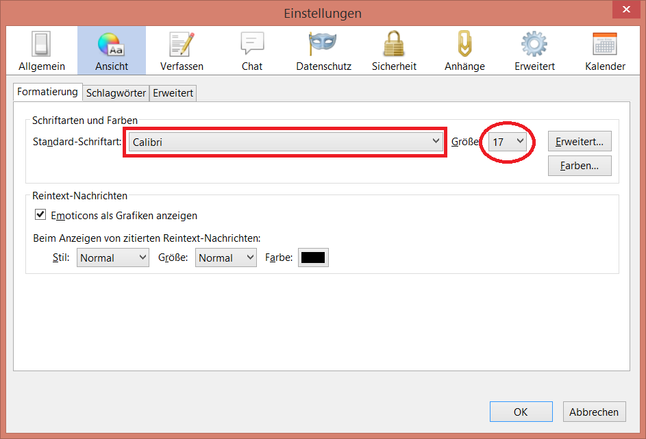 Ich würde gerne "Times New Roman, Größe 12" als Standardschrift sowohl für empfangene E-Mails als auch zum Schreiben/Beantworten von E-Mails verwenden! Welche Einstellungen muß ich treffen, damit geschriebene E-Mails von mir immer in der gleichen Schrift versendet werden?