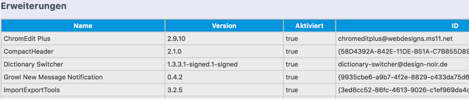 seit Stunden - leider wahr - versuche ich erfolglos von Stuttgart aus in Paris auf dem Rechner eines Angehörigen eine ganze Latte alter Addon-Einträge im Addon-Manager zu entfernen, Addons, die nicht mehr kompatibel sind und die auch keinen Eintrag zum Entfernen anzeigen. Auch über about:config ist mir bislang das Entfernen nicht gelungen. So sieht das Ende der kompatiblen Addons und der Anfang der Liste der inkompatiblen Addons aus bei uns: ![]()