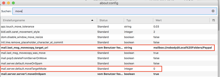das Verschieben in ... ist eine schnelle Möglichkeit, Nachrichten im Postengang nach dem Lesen zu verschieben, allerdings merkt sich Thunderbird die letzte Verschiebe-Aktion und bietet diesen Ordner als Default an. Genau das hatte ich in früheren Versionen durch Ändern einer (Boolschen) Konfigurations-Variablen verhindert. Nach dieser Änderung wird immer der gleiche Ordner angezeigt, also fixiert.