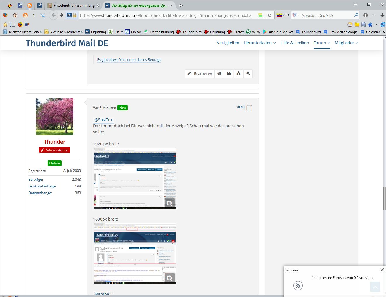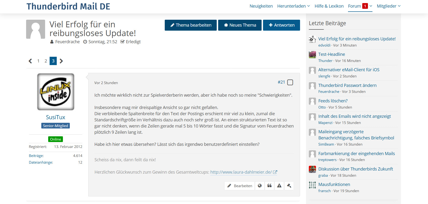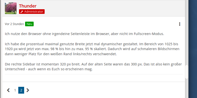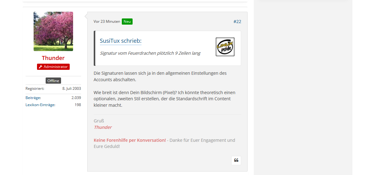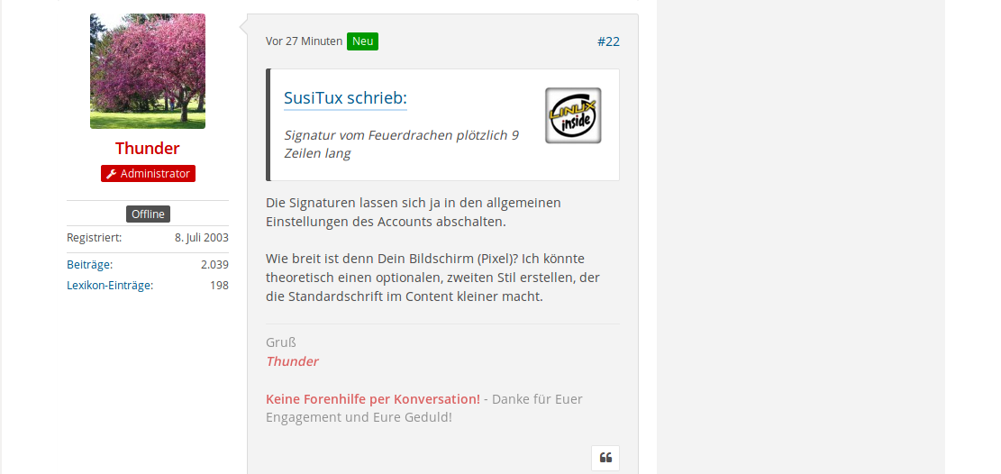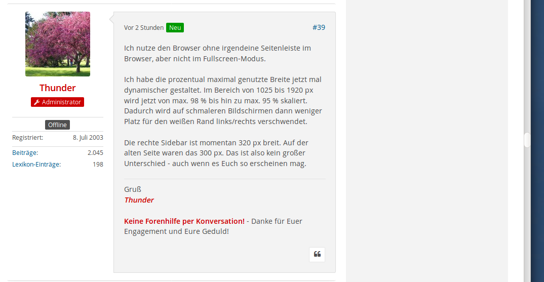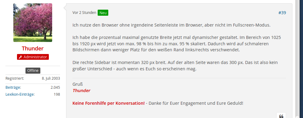 Die verbleibende Spaltenbreite für den Text der Postings erschient mir viel zu klein, zumal die Standardschriftgröße im Verhältnis dazu auch noch sehr groß ist. An einen strukturierten Text ist so gar nicht denken, wenn die Zeilen gerade mal 5 bis 10 Wörter fasst und die Signatur vom Feuerdrachen plötzlich 9 Zeilen lang ist.