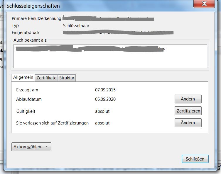 GPG4Win findest du im Windows-Startmenü unter "Alle Programme - GPG4Win", und dort kannst du GPA oder Kleopatra aufrufen. In GPA werden alle Schlüssel aufgelistet, und wenn du deinen eigenen anklickst, siehst du im unteren Teil die Zeilen: