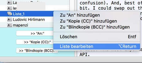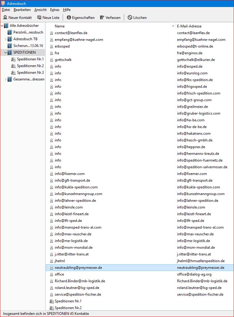 hallo, mein problem ist folgendes. ich habe im adressbuch einen ordner mit namen "speditionen" erstellt. dort sind ca. 100 mails enthalten. nun kann ich diese alle markieren und mit der rechten maustaste auf "verfassen" drücken. nur leider öffnet sich da nicht mein vorgefertigter entwurf sondern eine ganz neue seite um die mails abzuschicken. alle mails sind hervorragend eingetragen und ich müsste nur noch auf "bcc" drücken. aber es nützt mir nichts, ich brauche die mails in meiner vorlage. will ich mir eine verteilerliste anlegen, so kann ich immer nur eine einzige mail per hand eintragen. da bräuchte ich tage dazu um meine mails in die verteiler einzutragen. also meine fragen wären: