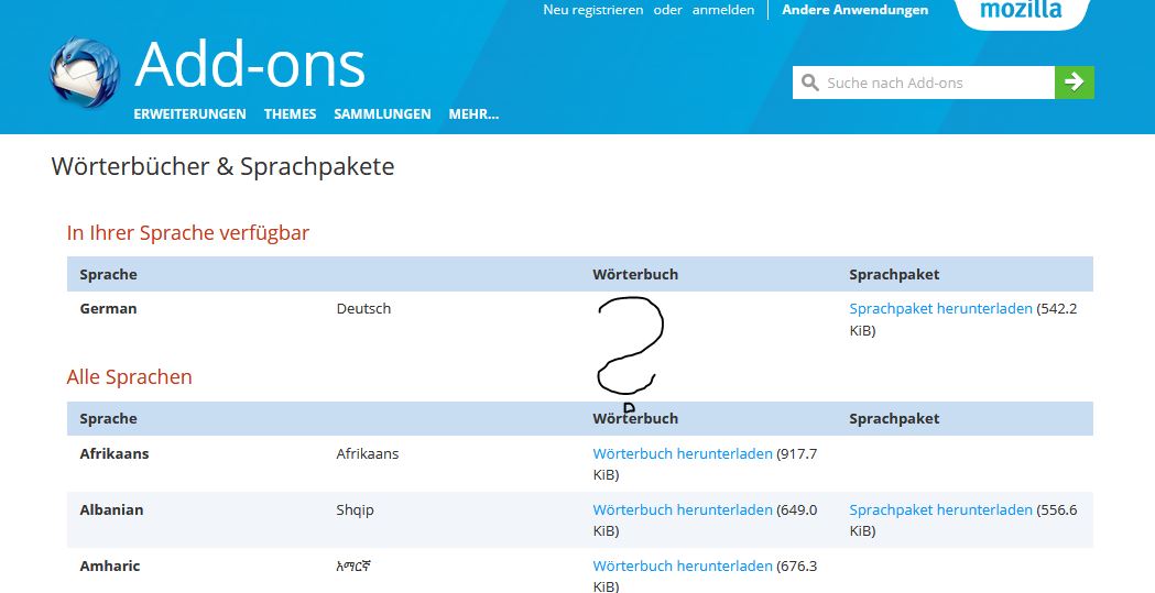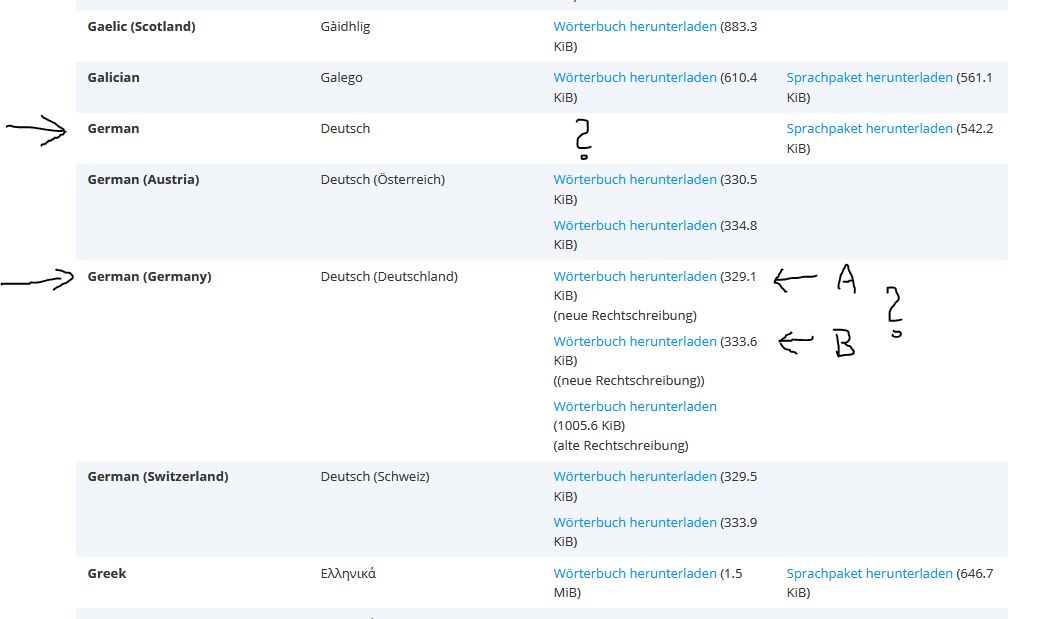Dann, beim sicherheitshalber doch noch weiter unten suchen, findet man zuerst erneut eine Zeile für Deutsch, in der ebenfalls kein Wörterbuch verfügbar ist (gut, das passt dann wenigstens mit der obigen Information zusammen), aber wenig darunter ist dann noch eine Zeile für Deutsch, und da sind dann gleich drei Wörterbücher verfügbar, eins in alter Rechtschreibung, und zwei (!!) in neuer Rechtschreibung (welches nimmt man dann?):