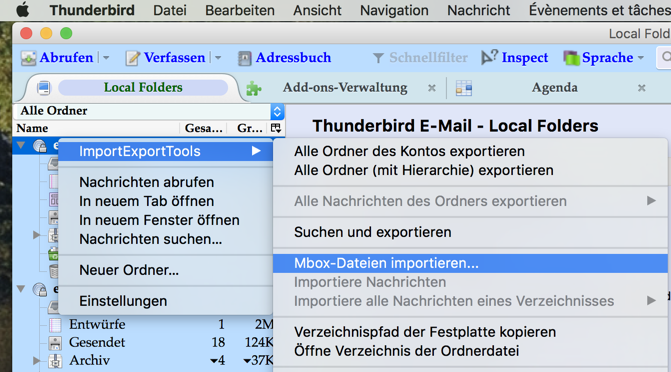 ich versuche nun schon seit 2013 erfoglos meine eMails von 2013-2015 von der alten Hardware auf die neue zu importieren (auf beiden Rechnern ist / war Thunderbird installiert. Ich habe Teile des alten Thunderbird Profils gesichert, in einem Ordner namens "pop.gmx.net" sehe ich die Dateien die ich importieren will (meist eine große Datei ohne Endung, sowie eine namensgleiche Datei mit der Endung "msf". Leider funktionierte bisher die Importfunktion von Thunderbird nicht. Nach "Extras -> importieren -> Nachrichten" kommt immer nur ein völlig leeres Fenster, ohne eine weitere Auswahlmöglichkeit?
