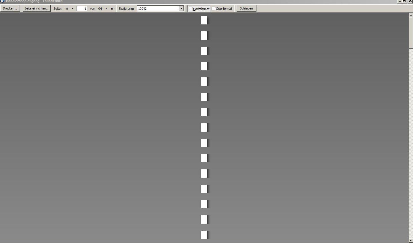Akuter Anfall von Betriebsblindheit mit Brett vorm Kopf ? Seit Tagen kann ich meine Mails nicht mehr ausdrucken, wenn ich "Drucken" > "Druckansicht" wähle erhalte ich immer die Ansicht wie im angehängten Bild. Es erscheinen unzählige leere Thumbnails. Bei ALLEN Mails. Egal was drinsteht.