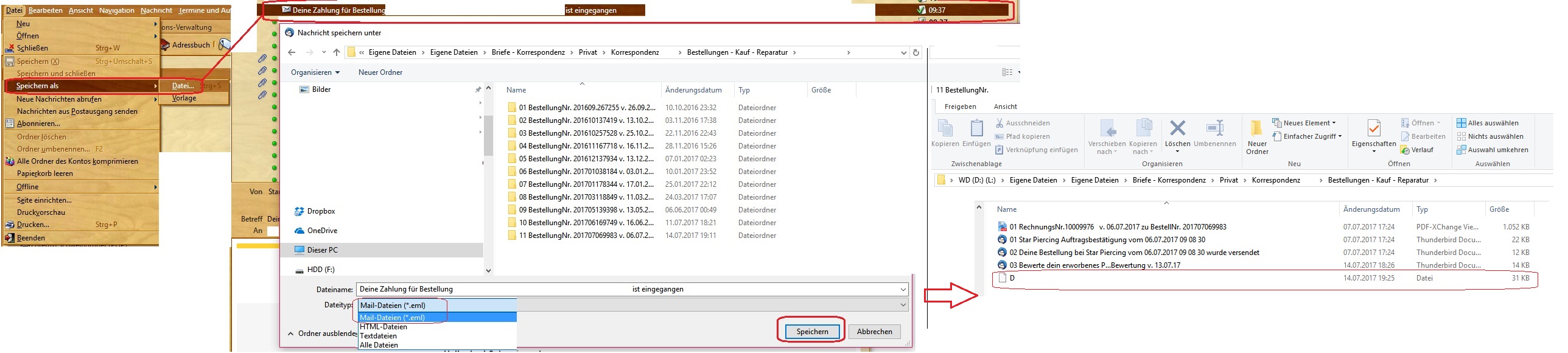 Was bisher immer geklappt hatte beim Speichern einer E-Mail Nachricht als Datei mit 'Mail-Dateien *.eml' war, dass ich eine Nummerierung vor dem Dateinamen setzte; z.B. 01 dann _Name der Datei_ und noch das Datum der E-Mail: z.B. v. 14.07.17