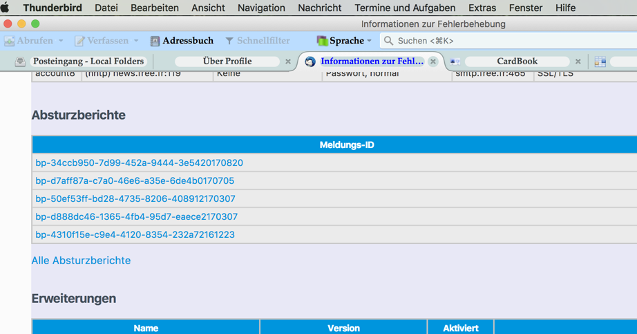 TelemetryEnvironment: {"build":{"applicationId":"{3550f703-e582-4d05-9a08-453d09bdfdc6}","applicationName":"Thunderbird","architecture":"x86-64","buildId":"20170815040357","version":"52.3.0","vendor":null,"platformVersion":"52.3.0","xpcomAbi":"x86_64-gcc3","hotfixVersion":null,"architecturesInBinary":"i386-x86_64"},"partner":{"distributionId":null,"distributionVersion":null,"partnerId":null,"distributor":null,"distributorChannel":null,"partnerNames":[]},"system":{"memoryMB":8192,"virtualMaxMB":null,"cpu":{"count":4,"cores":2,"vendor":"GenuineIntel","family":6,"model":69,"stepping":1,"l2cacheKB":256,"l3cacheKB":3072,"speedMHz":2600,"extensions":["hasMMX","hasSSE","hasSSE2","hasSSE3","hasSSSE3","hasSSE4_1","hasSSE4_2","hasAVX","hasAVX2"]},"os":{"name":"Darwin","version":"16.7.0","locale":"de-AT"},"hdd":{"profile":{"model":null,"revision":null},"binary":{"model":null,"revision":null},"system":{"model":null,"revision":null}},"gfx":{"D2DEnabled":null,"DWriteEnabled":null,"ContentBackend":"Skia","adapters":[{"description":null,"vendorID":"0x8086","deviceID":"0x0a2e","subsysID":null,"RAM":null,"driver":null,"driverVersion":null,"driverDate":null,"GPUActive":true}],"monitors":[{"screenWidth":1280,"screenHeight":800,"scale":2},{"screenWidth":1920,"screenHeight":1080,"scale":1}],"features":{"compositor":"none"}}},"settings":{"blocklistEnabled":true,"e10sEnabled":false,"e10sCohort":"unknown","telemetryEnabled":false,"locale":"de","update":{"channel":"release","enabled":true,"autoDownload":true},"userPrefs":{"browser.cache.disk.capacity":358400},"addonCompatibilityCheckEnabled":true,"isDefaultBrowser":null},"profile":{"creationDate":16560},"addons":{"activeAddons":{"{a300a000-5e21-4ee0-a115-9ec8f4eaa92b}":{"blocklisted":false,"description":"Locates duplicate messages in mail folders and removes them.","name":"Remove Duplicate Messages (Alternate)","userDisabled":false,"appDisabled":false,"version":"0.3.12","scope":1,"type":"extension","foreignInstall":false,"hasBinaryComponents":false,"installDay":16785,"updateDay":16785,"isSystem":false},"colorfolders@fisheater.com":{"blocklisted":false,"description":"Color Folder Treeview Icons.","name":"Color Folders","userDisabled":false,"appDisabled":false,"version":"1.1","scope":1,"type":"extension","foreignInstall":false,"hasBinaryComponents":false,"installDay":17205,"updateDay":17205,"isSystem":false},"fid@axiom":{"blocklisted":false,"description":"Wählt beim Versenden einer E-Mail die Absenderadresse nach vordefinierten \nRegeln aus.","name":"Flexible Identität","userDisabled":false,"appDisabled":false,"version":"1.0.4","scope":1,"type":"extension","foreignInstall":false,"hasBinaryComponents":false,"installDay":17291,"updateDay":17291,"isSystem":false},"profile-buttons-single@codefisher.org":{"blocklisted":false,"description":"A button to be able to open the profile folder, along with two buttons to create profiles, and also ","name":"Profile Buttons","userDisabled":false,"appDisabled":false,"version":"1.1.3","scope":1,"type":"extension","foreignInstall":false,"hasBinaryComponents":false,"installDay":17303,"updateDay":17303,"isSystem":false},"autocorrect@miller.micro":{"blocklisted":false,"description":"AutoCorrect for the Compose window.","name":"mmsAutoCorrect","userDisabled":false,"appDisabled":false,"version":"1.0.3","scope":1,"type":"extension","foreignInstall":false,"hasBinaryComponents":false,"installDay":16785,"updateDay":17303,"isSystem":false},"gsearch@standard8.plus.com":{"blocklisted":false,"description":"Adds Google Search to Thunderbird","name":"Google Search for Thunderbird","userDisabled":false,"appDisabled":false,"version":"1.0","scope":1,"type":"extension","foreignInstall":false,"hasBinaryComponents":false,"installDay":17205,"updateDay":17303,"isSystem":false},"{61A64500-335C-418D-8FCB-E072A9ABF3DA}":{"blocklisted":false,"description":"Fügt eine Symbolleiste hinzu um mit den Schlagwörter zu arbeiten.","name":"Tag Toolbar","userDisabled":false,"appDisabled":false,"version":"0.9.00","scope":1,"type":"extension","foreignInstall":false,"hasBinaryComponents":false,"installDay":16561,"updateDay":17306,"isSystem":false},"{ada4b710-8346-4b82-8199-5de2b400a6ae}":{"blocklisted":false,"description":"Anzeigen und verwalten von Terminen und Aufgaben","name":"ReminderFox","userDisabled":false,"appDisabled":false,"version":"2.1.5.6","scope":1,"type":"extension","foreignInstall":false,"hasBinaryComponents":false,"installDay":16671,"updateDay":17346,"isSystem":false},"sendlater3@kamens.us":{"blocklisted":false,"description":"Eine erweiterte „Später senden”-Funktion zur Planung der Sendezeit","name":"Später Senden","userDisabled":false,"appDisabled":false,"version":"6.2.1","scope":1,"type":"extension","foreignInstall":false,"hasBinaryComponents":false,"installDay":16630,"updateDay":17347,"isSystem":false},"{a62ef8ec-5fdc-40c2-873c-223b8a6925cc}":{"blocklisted":false,"description":"Erlaubt beidseitigen Zugriff auf Google Kalender","name":"Provider für Google Kalender","userDisabled":false,"appDisabled":false,"version":"3.3","scope":1,"type":"extension","foreignInstall":false,"hasBinaryComponents":false,"installDay":17369,"updateDay":17369,"isSystem":false},"{2ab1b709-ba03-4361-abf9-c50b964ff75d}":{"blocklisted":false,"description":"Die Signatur ein-/ausschalten, oder aus einer vorgefertigten Liste wählen.","name":"Signature Switch","userDisabled":false,"appDisabled":false,"version":"1.6.16","scope":1,"type":"extension","foreignInstall":false,"hasBinaryComponents":false,"installDay":16735,"updateDay":17393,"isSystem":false},"{e2fda1a4-762b-4020-b5ad-a41df1933103}":{"blocklisted":false,"description":"Ein integrierter Kalender für einige E-Mail-Programme","name":"Lightning","userDisabled":false,"appDisabled":false,"version":"5.4.3","scope":1,"type":"extension","foreignInstall":false,"hasBinaryComponents":false,"installDay":16670,"updateDay":17396,"isSystem":false}},"theme":{"id":"286995@personas.mozilla.org","blocklisted":false,"description":null,"