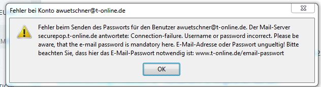 Hier können Sie Ihren Text schreiben: Seit einer Woche (nach Rückkehr aus dem Urlaub und während des Urlaubs Thunderbird nur 1x verwendet) kann ich weder mails senden noch abrufen. Es kommt immer die Meldung: Fehler beim senden des Passworts... (siehe Anhang). Ich habe lt. Hilfeseite das Passwort gelöscht und versucht neu einzugeben, aber ohne Erfolg. Auch ist, wie schon in anderen Beiträgen beschrieben, an der mail-adresse das Schloß eingeblendet. Die Vorgenehsweise mit Telnet funktioniert um Übrigen auch nicht. Wer kann mir helfen? Vielen Dank im Voraus.