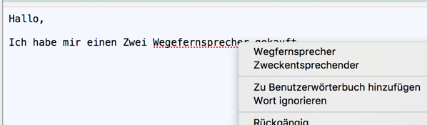 Beispiel: bei Zwei Wegefernsprecher bietet er mir an "Wegeßfernsprecher" richtig müsste es heissen " 2 Wege- Fernsprecher"