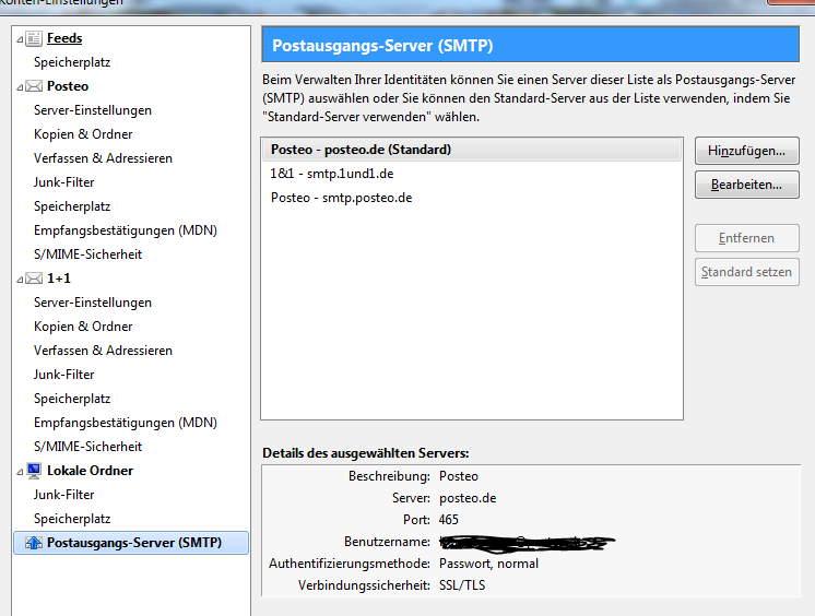 Auch wenn der andere Posteo-Eintrag als Standard gesetzt ist oder in der Auswahl das 1+1 Konto als Absender gesetzt ist, erfolgt kein Versand, ebenso wie das Setzen von STARTTLS...