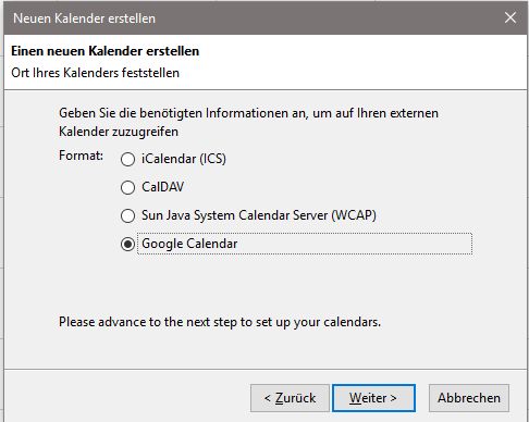 Beim Einrichten im TB erscheint das Fenster links und nach dem Klick auf "Google Kalender" erscheint das Fenster rechts.
