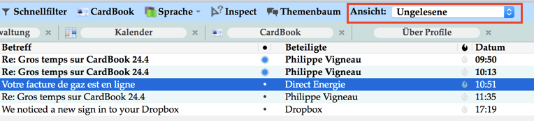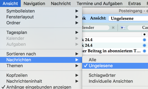 - Wenn ich dann in einen anderen Ordner wechsle und in den Posteingang zurück kehre, sind die gelesenen Mails weg und nur noch die ungelesenen zu sehen.