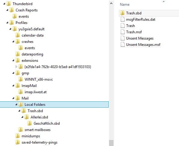 Im Thunderbird-Profilordner "xxxxxxxx.default" öffne den Ordner "Mail", in dem sich ein Unterordner "Local Folders" befindet. Öffne diesen und suche nach Dateien ohne Endung, die die Namen der von dir in den "Lokalen Ordnern" erstellten Ordnern tragen, z. B. "Logindaten", "Rechnungen", "Lohnzettel".....