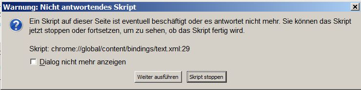 Ich habe eine Mal bekommen (Call for papers von IJEAS Publication), bei der Thunderbird regelmäßig abstürzt, wenn ich sie in der Eingangsliste highlighte. Die Fehlermeldung deutet auf ein hängendes Skript (chrome://global/content/binding/text.xml:29 (s. Anhang). Da ich die Mail zum Löschen oder verschieben in Junk zunächst highlighten muss, werde ich sie nicht los und muss jedes Mal, wenn ich zufällig wieder drauf komme, neu starten. Möglicherweise hängt das Skript beim automatischen Anzeigen der Vorschau, ich habe aber keine Möglichkeit efunden, diese Funktion abzustellen. Kann da jemand helfen?