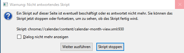 Seit ein paar Tagen funktioniert der Kalender nicht mehr. Beim Start von Thunderbird gibt es starke Verzögerungen. Pro Mausklick ca. 3-5 Minuten (nicht Sekunden). So bald ich das AddOn deaktivieren läuft alles normal.