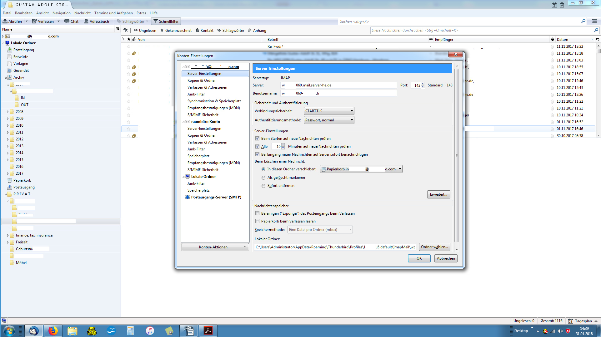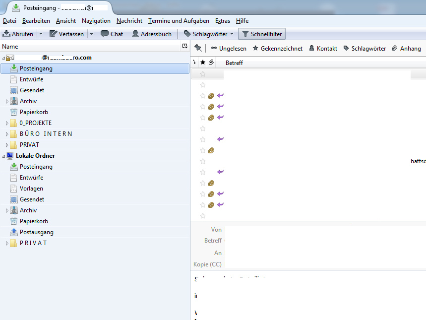 Danach hättest du weiterhin die selbe Ansicht links in der Konten/Ordnerliste, d. h. in den Lokalen Ordnern werden weiterhin die Ordner und Nachrichten deines alten POP-Kontos angezeigt, und diese können auch weiterhin geöffnet und gelesen werden.