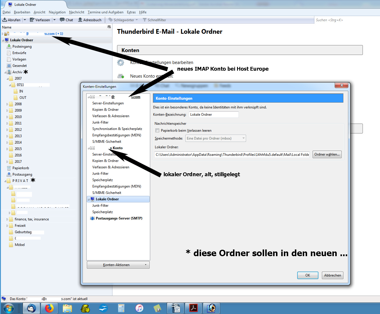 Hallo Mapenzi, vielen Dank, dass du dir Zeit nimmst. Deinen Vorschlag, den Wert im "mailnews.tcptimeout" zu erhöhen habe ich umgesetzt und bin gespannt, ob es hilft. Zum Hauptproblem: Ich habe tatsächlich, wenn ich das überhaupt noch richtig zusammen kriege, unter Extras/Konten-Einstellungen/Konten-Aktionen/E-Mail-Konto hinzufügen ... ein neues Konto angelegt für den neuen Email-Provider HostEurope. Also die Servereinstellungen gem. Empfehlung des Anbieters etc. vorgenommen und nach einigem Hin und Her und Erzeugung vieler Ordner und Unterordner meine Konto in Händen gehalten. Die alten Mails habe ich teils durch diretes Verschieben in dieser Benutzeroberfläche (mein screenshot), teils über ImportExportTools, in die neu und wie du richtig sagst, gleichlautenden Ordner verschoben bzw. kopiert und dann im alten Ordner (Benutzeroberfläche) gelöscht. Das hat endlos lange gedauert, nicht zuletzt, weil die "timeout"-Meldung dauernd kam, der Kopiervorgang irgendwann abbrach, und überhaupt! Mit "riesigen alten Mails" meine ich also ganz unfachmännisch Ordner, in denen sich E-Mails mehrerer Jahre angesammelt haben. Ganz zu schweigen von den Ordnern im Archiv. Da reden wir definitiv vom GB-Bereich. Das würde mit meinen oben beschriebenen Methoden Tage dauern. Kann ich dir meine Ordnerstruktur irgendwie deutlicher darstellen? Schönen Gruß, Matiasowsky