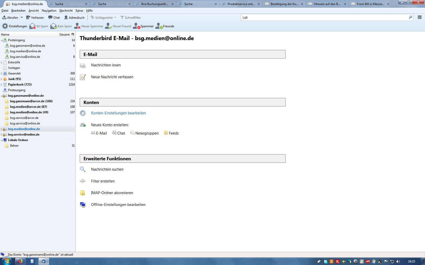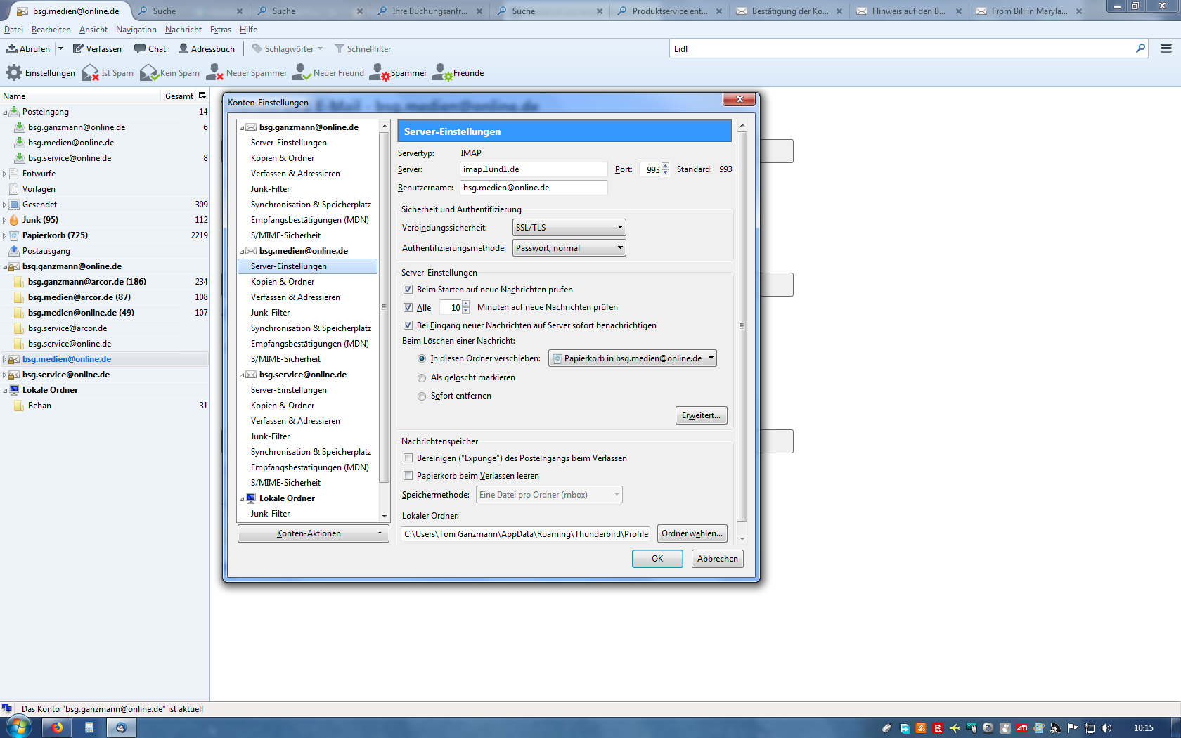 Nach Einrichtung des Thunderbirds funktioniert alles bestens. Da ich bei Arcor noch 4 e-mail-Adressen (im Präfix jeweils identisch mit den 1+1-Adressen) habe, habe ich bei meinen vier 1+1-Konten jeweils die Abfrage des namensgleichen Arcor-Kontos eingestellt. Nun holt aber jedes 1+1-Konto die eingegangenen Arcor-Mails ab und ich habe diese immer 4x im Thunderbird-Posteingang. Was habe ich falsch eingestellt?