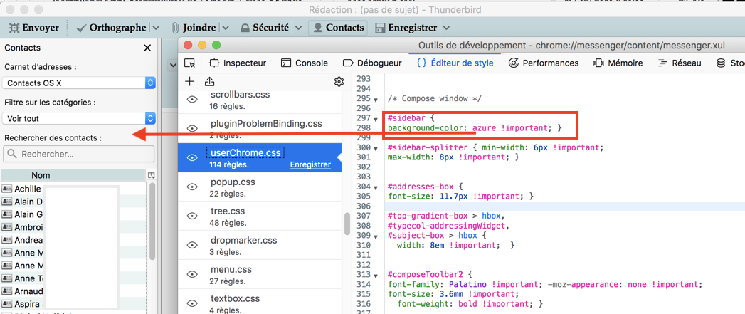 Wenn es um die Sidebar im Verfassen-Fenster geht, kannst du mal folgenden CSS-Code in deiner userChrome.css Datei testen: