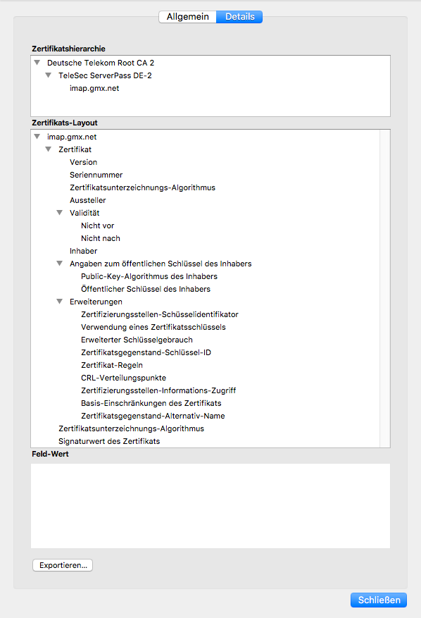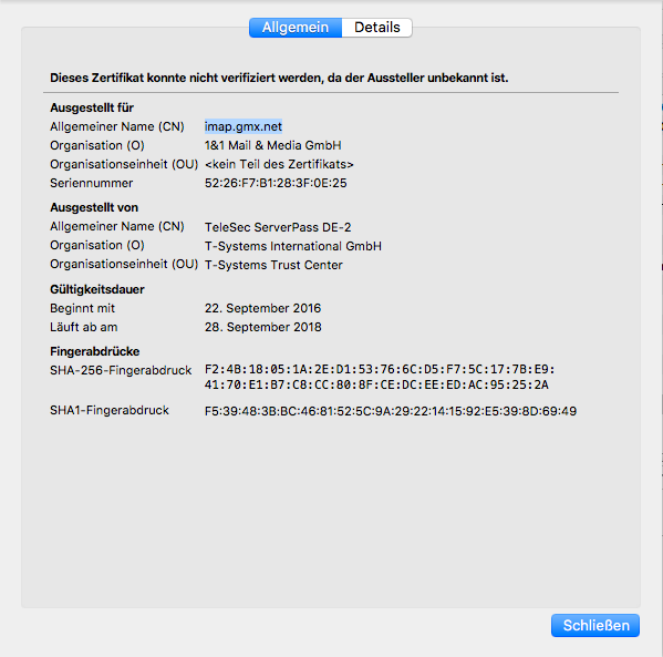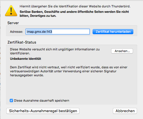 Meine beiden eigenen Mailkonten funktionieren einwandfrei (Senden und Empfangen), aber meine beiden GMX-Konten haben anschließend das Zertifikat von GMX abgelehnt, und der Button "Ausnahmeregel hinzufügen" war zwar klickbar, hatte aber keine Auswirkungen.