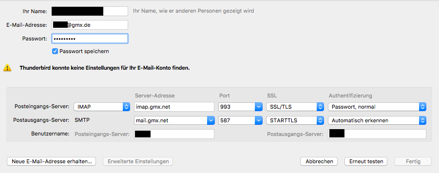 Bei den Konteneinstellungen hat mich irritiert, dass dort die Posteingangs- und Ausgangsserver auf ".de" enden, nach den Infos beim Anbieter müssten die aber auf ".net" enden.