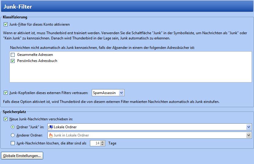 Es sieht aus wie bei dir. Ich habe jetzt mal die "Gesammelten Adressen" aktiviert und unten unter "Globale Einstellungen" auch noch das "Junk Protokoll für selbstlernenden Filter" aktiviert. Mal sehen, ob das was bringt, wenn die nächste Mail kommt.
