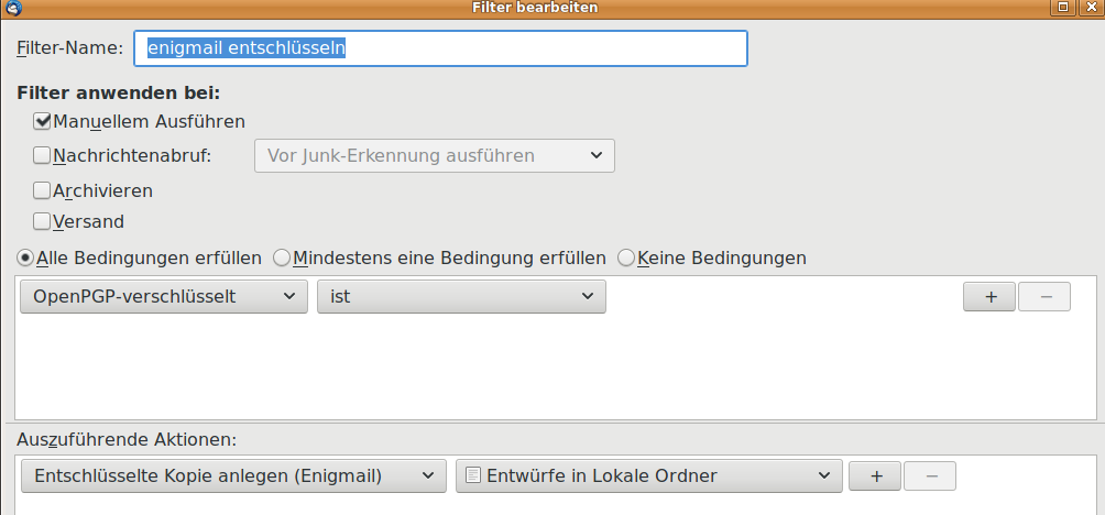 2) Mit dem Thunderbird Standard Theme konnte ich einen Filter 1 im IMAP-Ordner anlegen (Extras -> Filter -> Neu ...), mit dem ich alle verschlüsselten e-Mails aus dem IMAP Posteingang nach "Entwürfe" in Lokale Ordner kopiert habe. Vorher noch den Ordner "Entwürfe" in Lokale Ordner leer gemacht.
