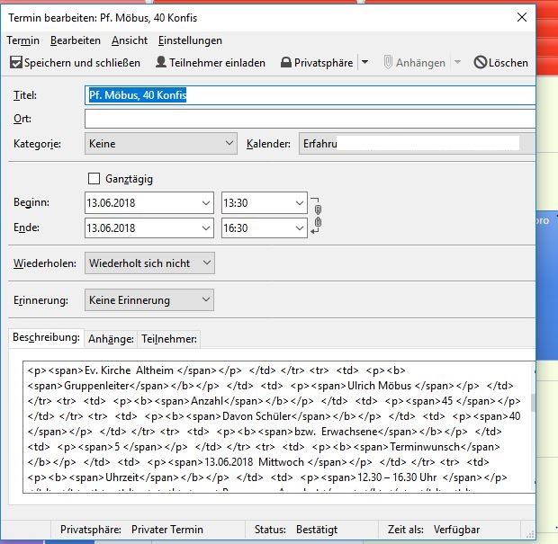 ich habe ein Problem das ich nicht lösen kann. Die Termin-Beschreibung wird mit den HTML-Tags angezeigt (siehe Anhang), weil ein Kollege von mir diese so einträgt. Was kann ich machen, damit der Text normal angezeigt wird?