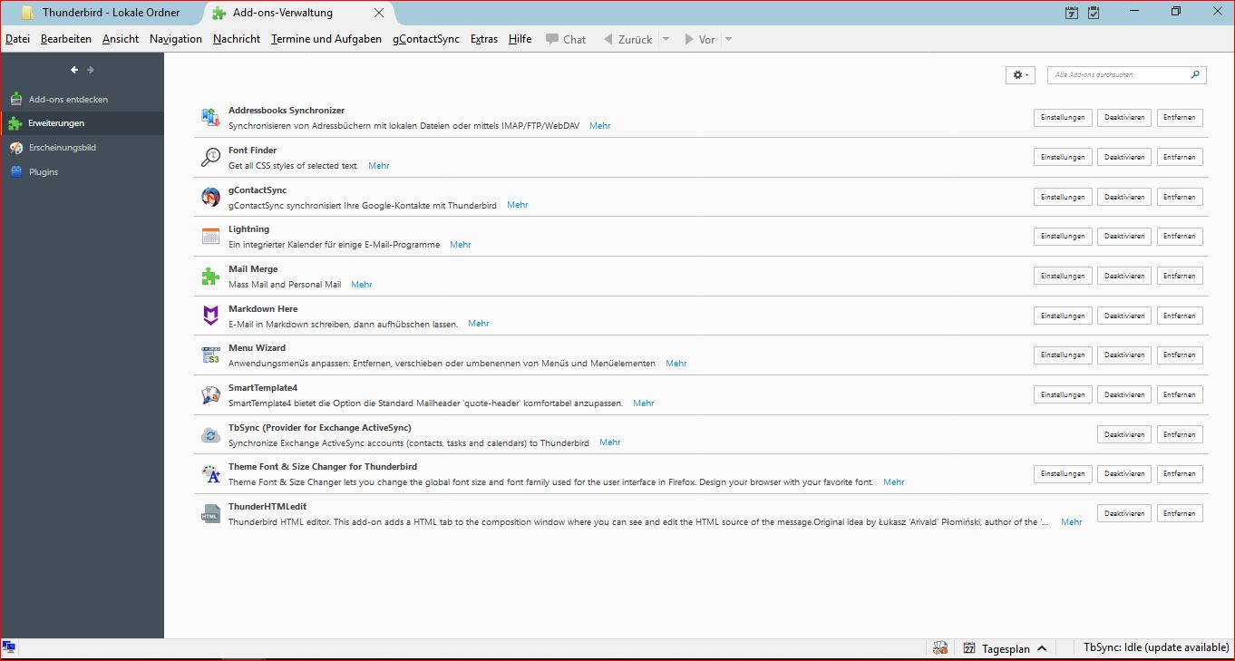 Also musste ich mir ein neues e-MailProgramm zu tun. Also habe ich mich für Thunderbird von Mozilla entschieden. Das ist jetzt mein HauptMailProgramm geworden. Es passt mir noch nicht alles, doch die Ablage ist phantastisch. Man hat viel Platz.